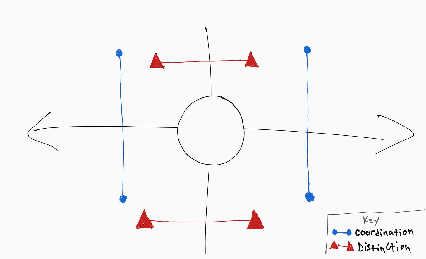 Coordination and distinction framing are two very basic types of relating that involve essentially every behavior we engage in. They both come first from the world of non-arbitrary relating, in other words relating via form. We can distinguish between colors, for example, and coordinate based on shape, closeness, etc.